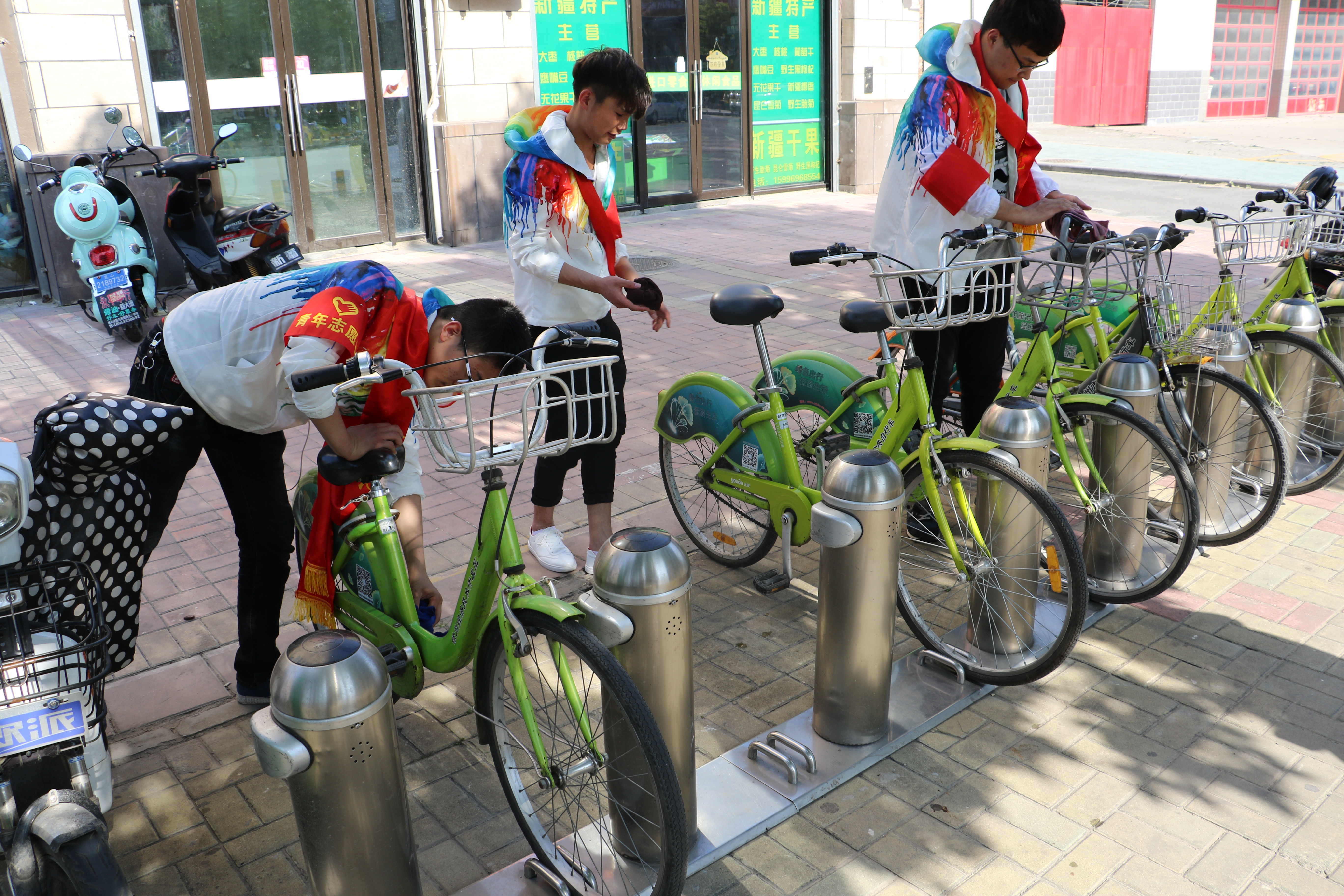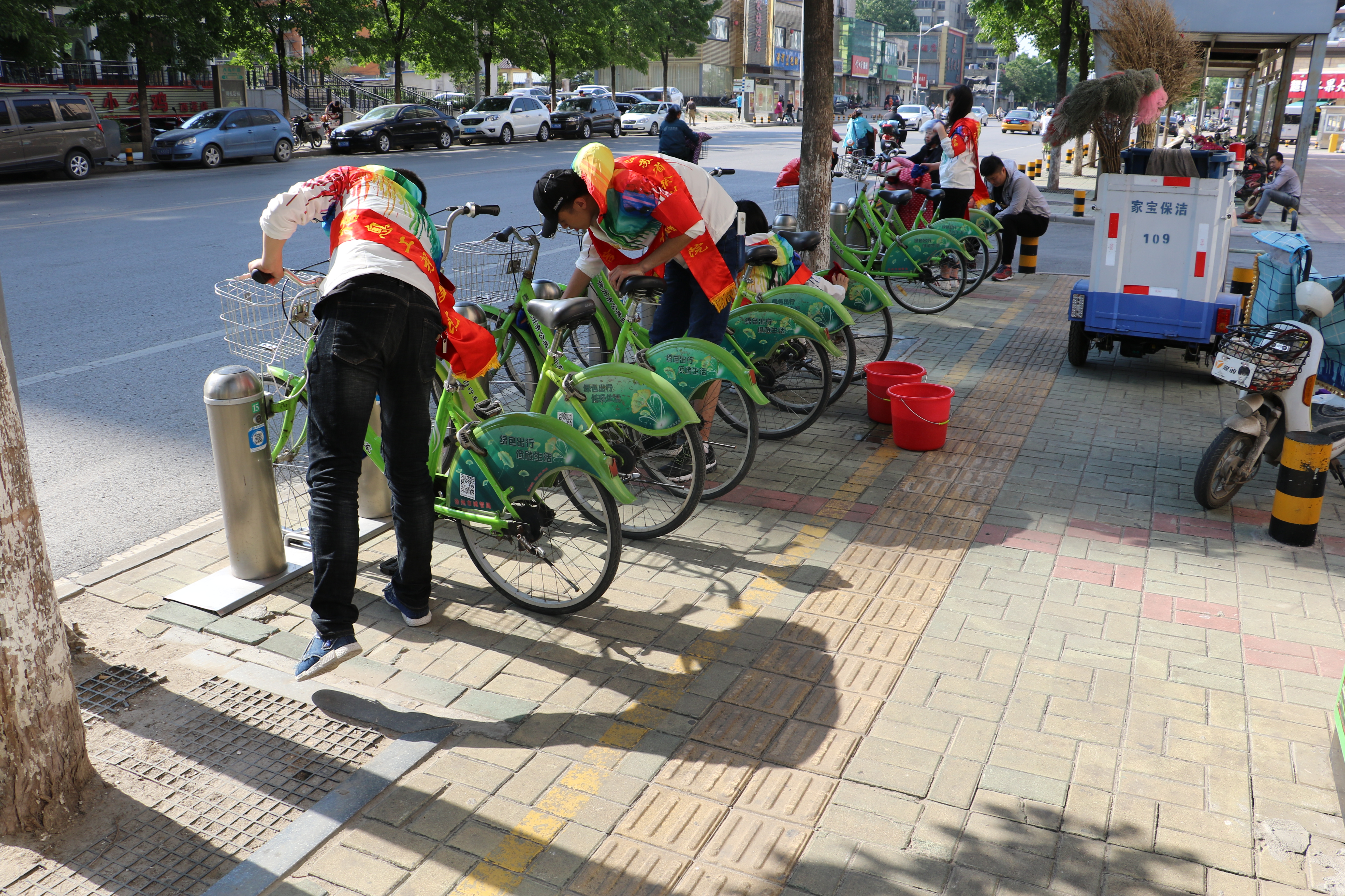 志愿者们统一服装、身披绶带,向社区群众发放“爱护公共自行车、争做文明徐州人”倡议书,并耐心的传达公益环保理念。随后,他们拎着水桶和抹布分组来到社区辖内的各公共自行车存放点,义务对公共自行车、机柜、锁车器、底板进行保洁,并友情提醒来借车的居民,爱护公物,维护美丽社区形象。志愿者们共为3个站点的五十多辆自行车进行了擦洗。